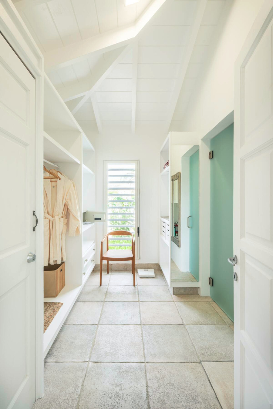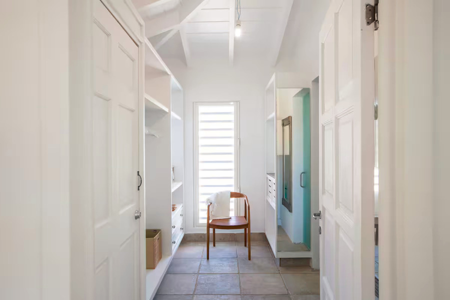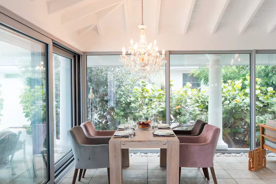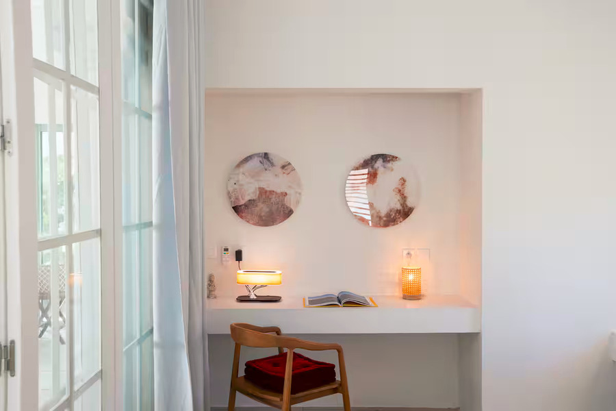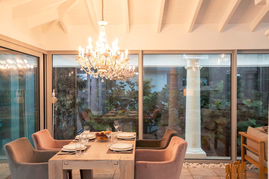 Inside, the villa boasts a light and airy interior adorned with a fusion of classical elegance and contemporary charm. Rich decor, blending classical styling with modern design elements and artistic accents, creates an ambiance of sophistication. A neutral color palette, accentuated by shades of beige and white, is complemented by luxurious fabrics, candelabra lamps, indirect lighting, sculptural pieces, and graceful furnishings.