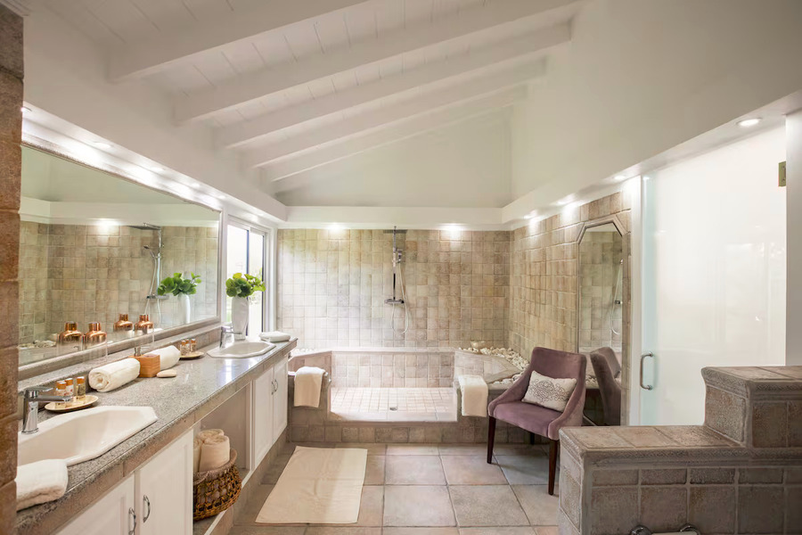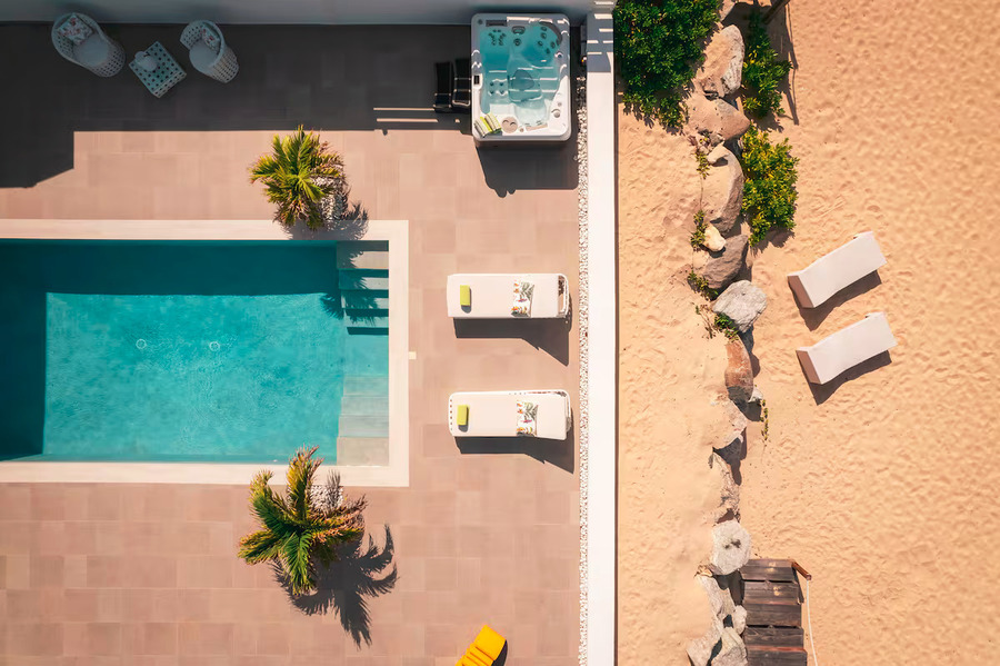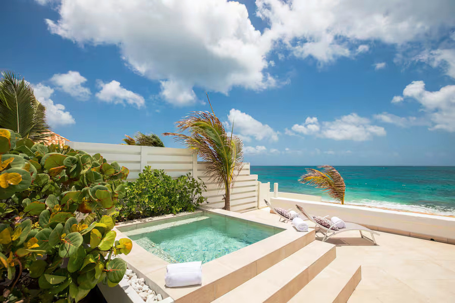 Each of the smaller villas provides guests with private pools, terraces, and stylish furnishings, along with modern amenities such as Jacuzzi tubs and open-air floor plans.