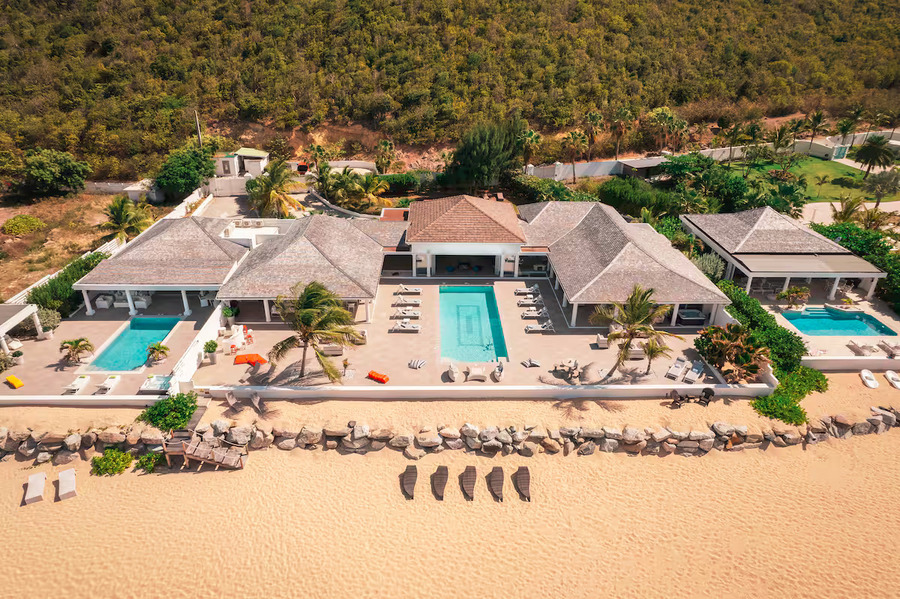 The main villa boasts impressive features, including private gardens, an oversized pool terrace facing the beach, and spacious covered terraces for al fresco dining and outdoor lounging. The gourmet kitchen is equipped with top-of-the-line appliances and offers breathtaking views, while additional amenities such as a fitness center, media room, and spa area ensure a truly luxurious experience.