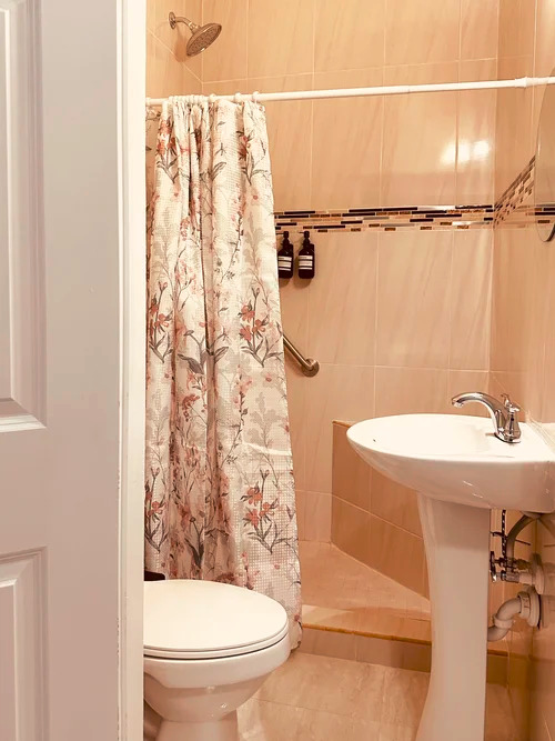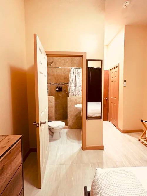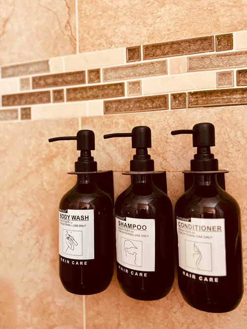 En-suite bathroom with large shower, and shampoo, conditioner, body soap