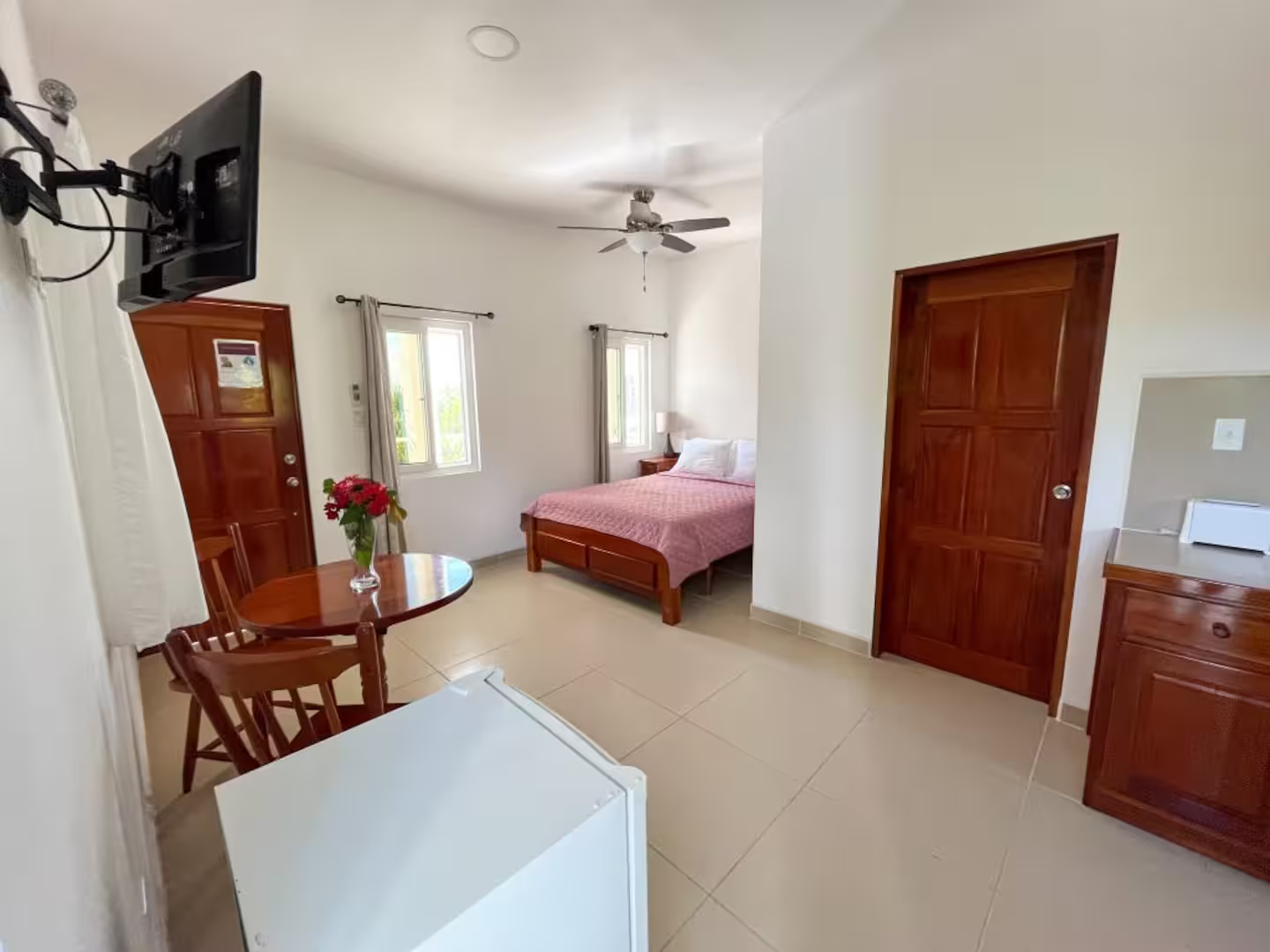 This room is located on the villa side and it was spotless! Entering the unit, it was bigger than expected and the private balcony was a great bonus. It faced the sun for those who wanted to get their tan on. Wifi can get spotty but they worked on it right away. Cecilia was accommodating and flexible for the check in. The pool is great for a midday dip. There's two dogs on the property that stays indoors. Location of the property is a few minutes outside of the village, walkable 10-15 minutes. Would recommend this for those who wants a quiet spot in the evenings.