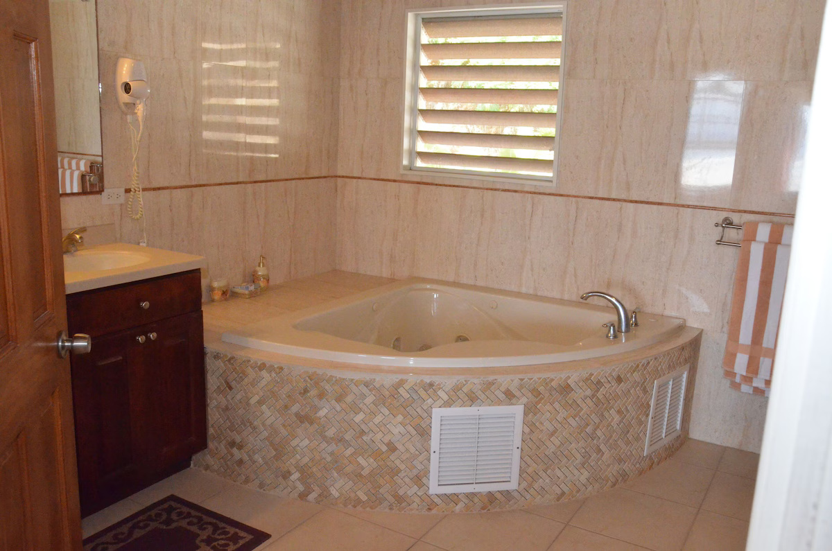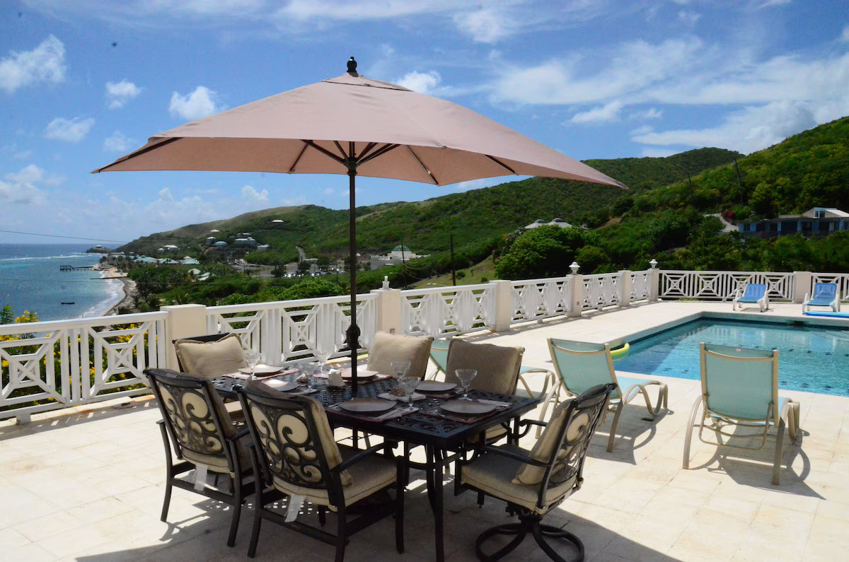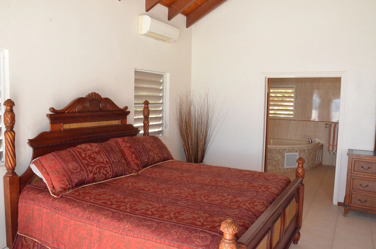 Type: VillaVilla with a private, romantic family friendly setting; master bedroom suite and guest bedrooms have french doors that open up to the pool and deck area overlooking the rolling hillsides and carribbean sea and a separate studio apartment with a queen size bed. Master bedroom suite is on the western part of the villa and has a king size bed, jacuzzi tub & separate shower, his & her sink, spacious walk-in closet. Guest bedrooms have queen size beds and are on the eastern part of the villa with a jack & jill bathroom a jacuzzi tub & separate shower with spacious closets. Half bathroom has sink & toilet. The studio apartment has a bathroom with an open shower & spacious living area. The kitchen has french doors that open up to the pool and deck with views of the carribbean sea & rolling hillsides. The kitchen is fully equipped with refrigerator, oven, dishwasher, dishes & flatware, microwave, toaster, coffee maker, blender, cocktail glasses, center island with plenty cabinet space, pantry items, dining area. Laundry room has washer, dryer, utility sink, folding table, ironing board. Televisions with Cable TV & DVD Players, radio & alarm clocks. Toilet paper, restaurant dining guide, split-system air conditioning, laundry soap, towels, paper towels, soaps, secure parking, ceiling fans, activities guide, shampoo, filtered water, internet, local maps, vacuum cleaner, hair dryer, linens provided. Outside: secure parking, gated, gas & charcoal grill, deck, beach towels, cooler, walk across street to beach and casino. dining table with umbrella & six chairs. In ground pool (3 - 6 ft). Scenic drives, walking, gambling casino, paddle boating, sight seeing, beach combing, walking distance to snorkeling.