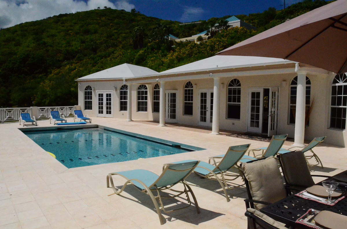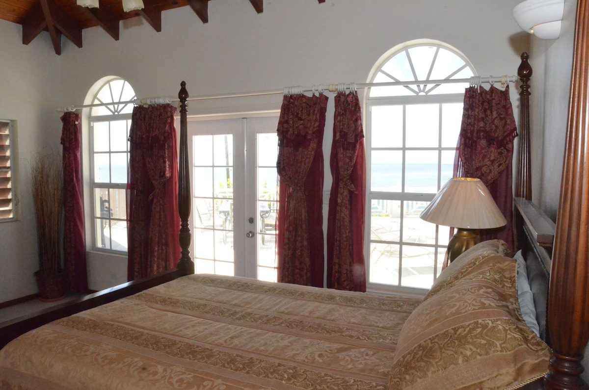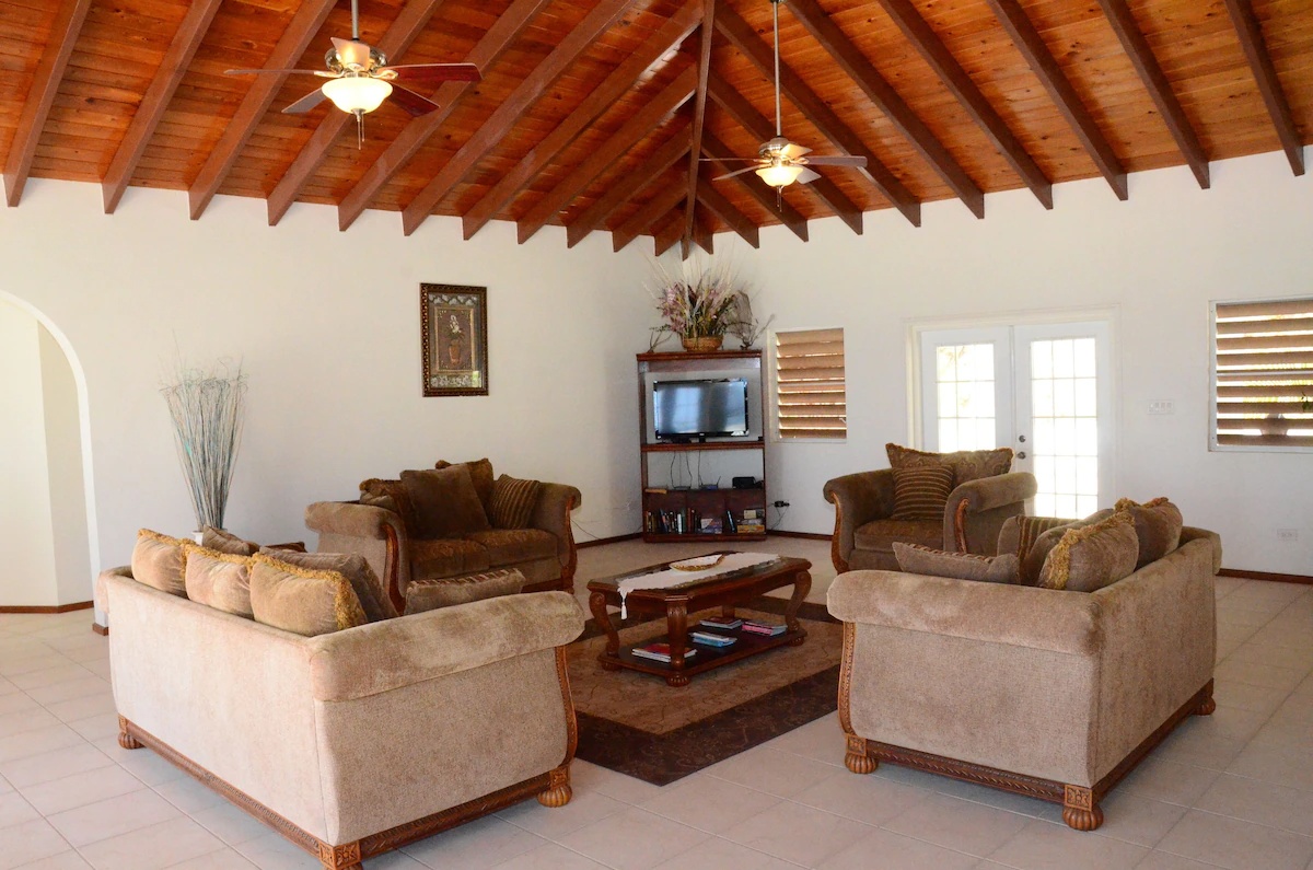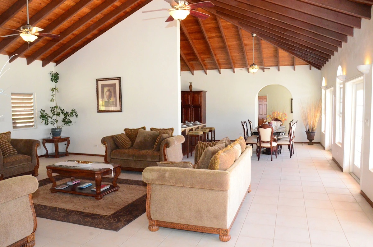 Type: VillaVilla with a private, romantic family friendly setting; master bedroom suite and guest bedrooms have french doors that open up to the pool and deck area overlooking the rolling hillsides and carribbean sea and a separate studio apartment with a queen size bed. Master bedroom suite is on the western part of the villa and has a king size bed, jacuzzi tub & separate shower, his & her sink, spacious walk-in closet. Guest bedrooms have queen size beds and are on the eastern part of the villa with a jack & jill bathroom a jacuzzi tub & separate shower with spacious closets. Half bathroom has sink & toilet. The studio apartment has a bathroom with an open shower & spacious living area. The kitchen has french doors that open up to the pool and deck with views of the carribbean sea & rolling hillsides. The kitchen is fully equipped with refrigerator, oven, dishwasher, dishes & flatware, microwave, toaster, coffee maker, blender, cocktail glasses, center island with plenty cabinet space, pantry items, dining area. Laundry room has washer, dryer, utility sink, folding table, ironing board. Televisions with Cable TV & DVD Players, radio & alarm clocks. Toilet paper, restaurant dining guide, split-system air conditioning, laundry soap, towels, paper towels, soaps, secure parking, ceiling fans, activities guide, shampoo, filtered water, internet, local maps, vacuum cleaner, hair dryer, linens provided. Outside: secure parking, gated, gas & charcoal grill, deck, beach towels, cooler, walk across street to beach and casino. dining table with umbrella & six chairs. In ground pool (3 - 6 ft). Scenic drives, walking, gambling casino, paddle boating, sight seeing, beach combing, walking distance to snorkeling.