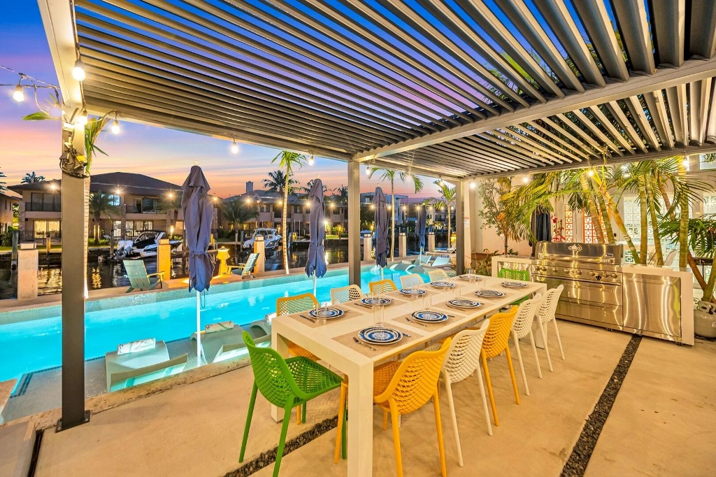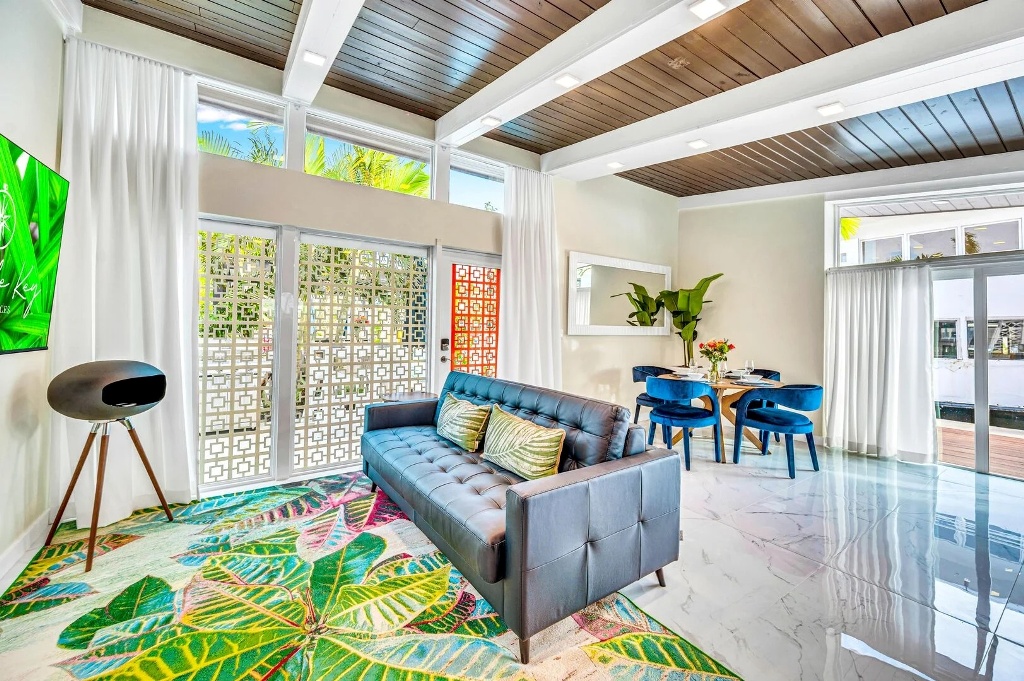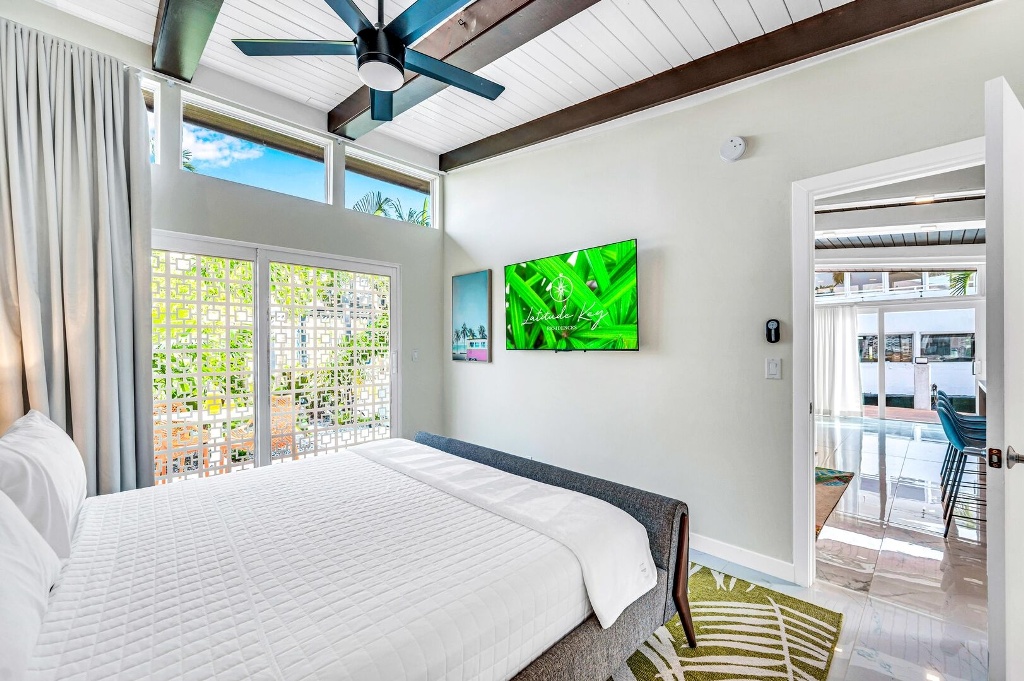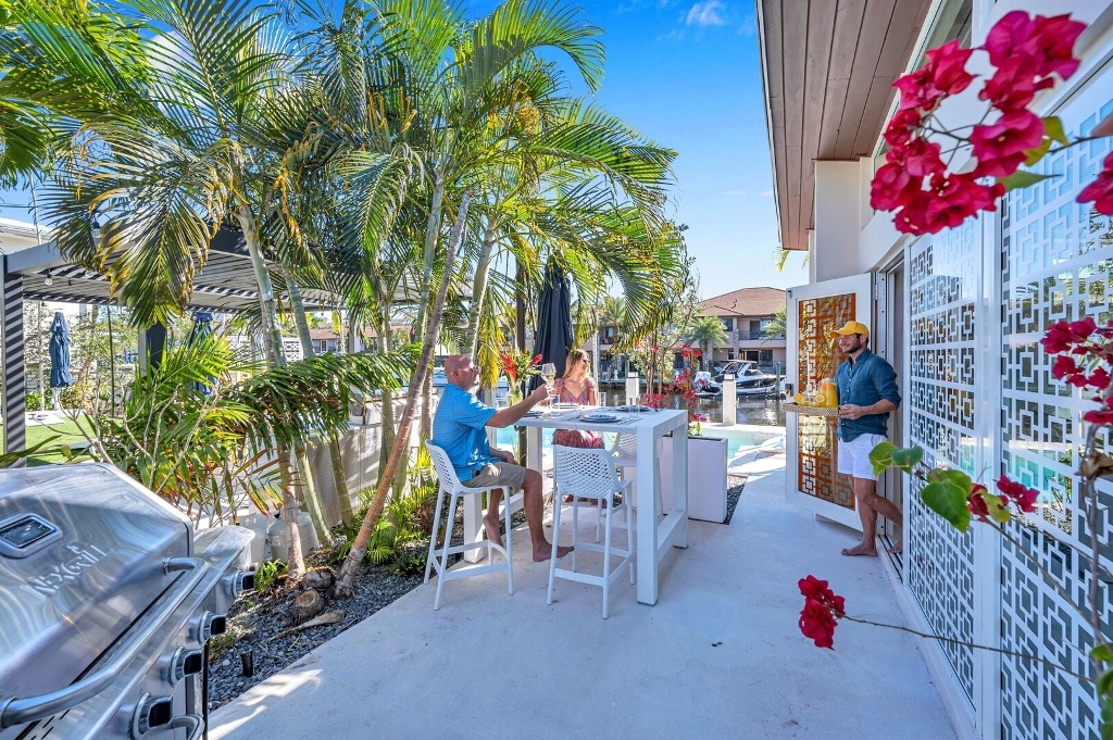 Located in a secluded midcentury style retreat, this ample suite offers waterfront tranquility with the common heated pool and backyard offering stunning views on the canal. A private patio boasts a dining table fit for eight. The retreat is composed of four suites and common spaces to unwind including a pool, lounge areas, 100' dock, al fresco dining and grilling.