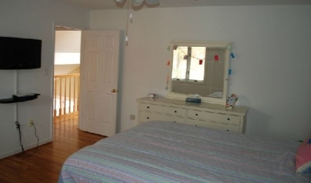 Overlooking Lake Lure and located just a very short walk from the resort\'s recreation complex, beach, pools, and marina is this spacious multilevel four bedroom vaction home. Oak hardwood floors run throughout the stay house except for the carpeted downstairs level. On the main level is a large living room with cathedral ceiling, sofa, 2 rattan chairs, stone gas log fireplace, and flat screen satellite TV. A handsome table in a dining area off the living room seats 8, while a breakfast nook off the kitchen seats 4. You\'ll find everything you need in the extra large kitchen: food pantry, loads of counter and cabinet space, ceramic stovetop range, side-by-side refrigerator/freezer, microwave, convection oven, dishwasher, coffeemaker, toaster, and even a temperature-controlled wine cooler. Off the kitchen is a laundry room with washer and dryer. This house includes wireless internet access plus a computer printer for guests to use.