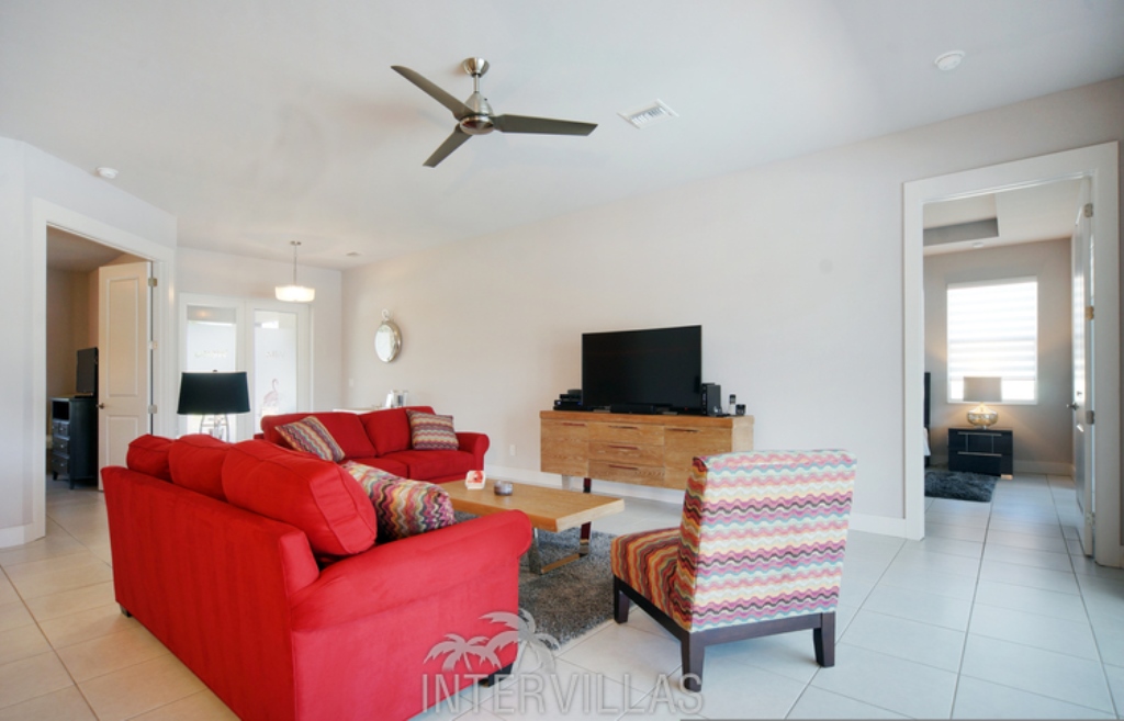 On the left side of the house is the master bedroom and master bathroom with walk-in XL shower and bathtub. The three other bedrooms with their corresponding two bathrooms are on the right side of the house. A laundry room with washer and dryer is also available. The living room, kitchen with quartz island and counters as well as the dining area are located in the center of the house. Of course each bedroom has its own LED TV. The living room has a large flat screen with DVD - player and Bose sound system.